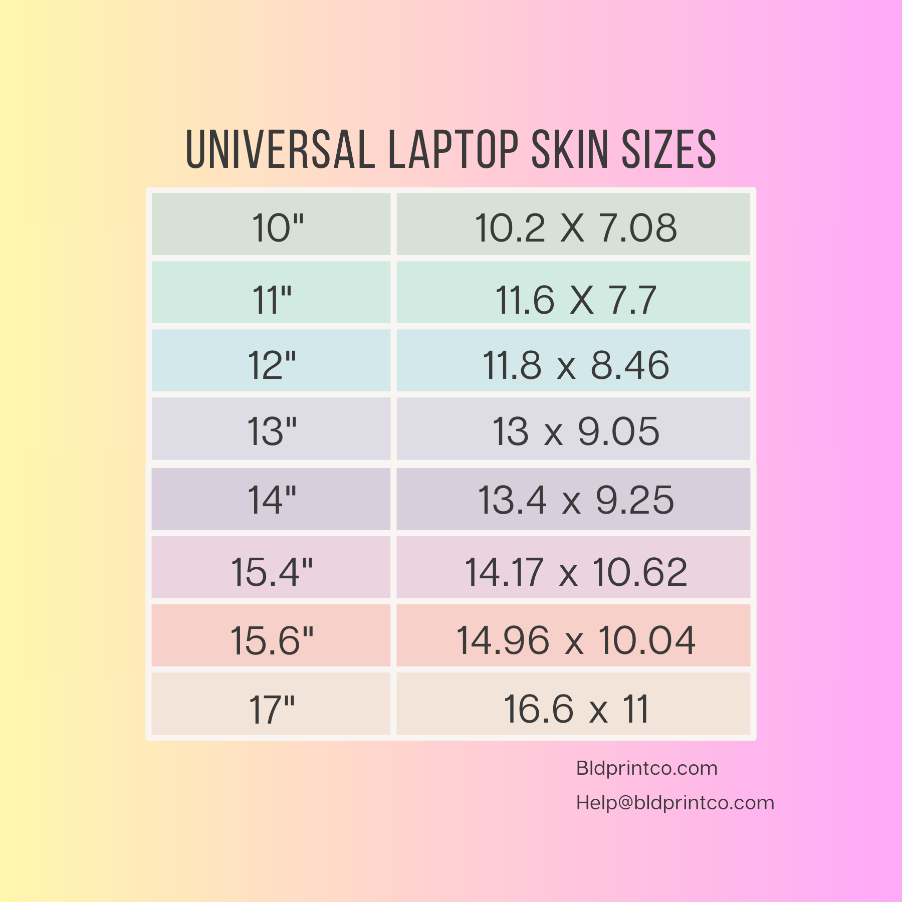 Measurements: Measure your laptop (L X W) and choose the best fit. You may also, choose the next size up and DIY trim the edges for an edge to edge fit. **While we do our very best to measure and cut exact, UNIVERSAL skins may need to be trimmed, we recommend a SHARP exacto knife or scissors to trim.